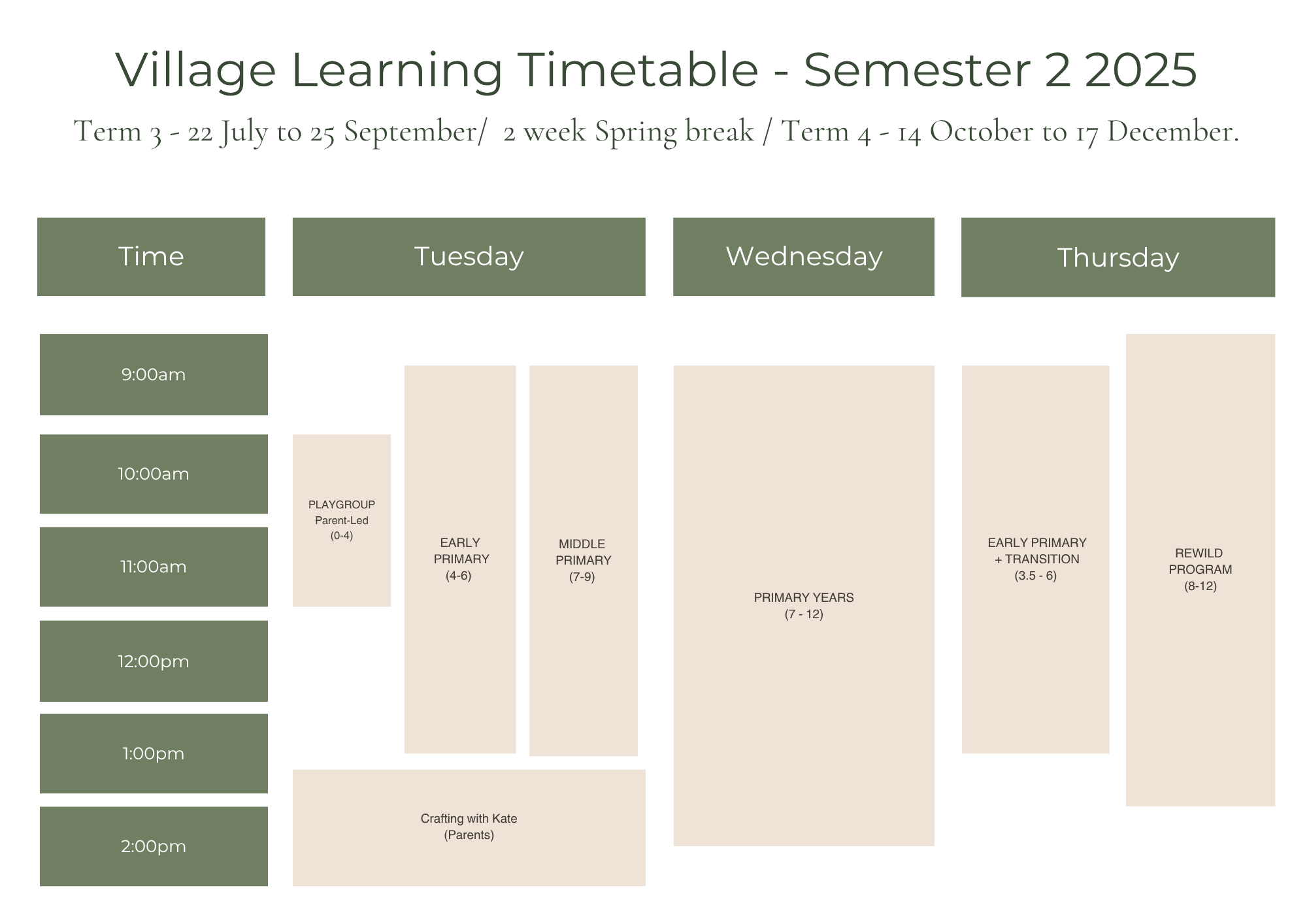 Please see below for our semester timetables, general Village Learning information and specific information on our programs and classes for each age group.